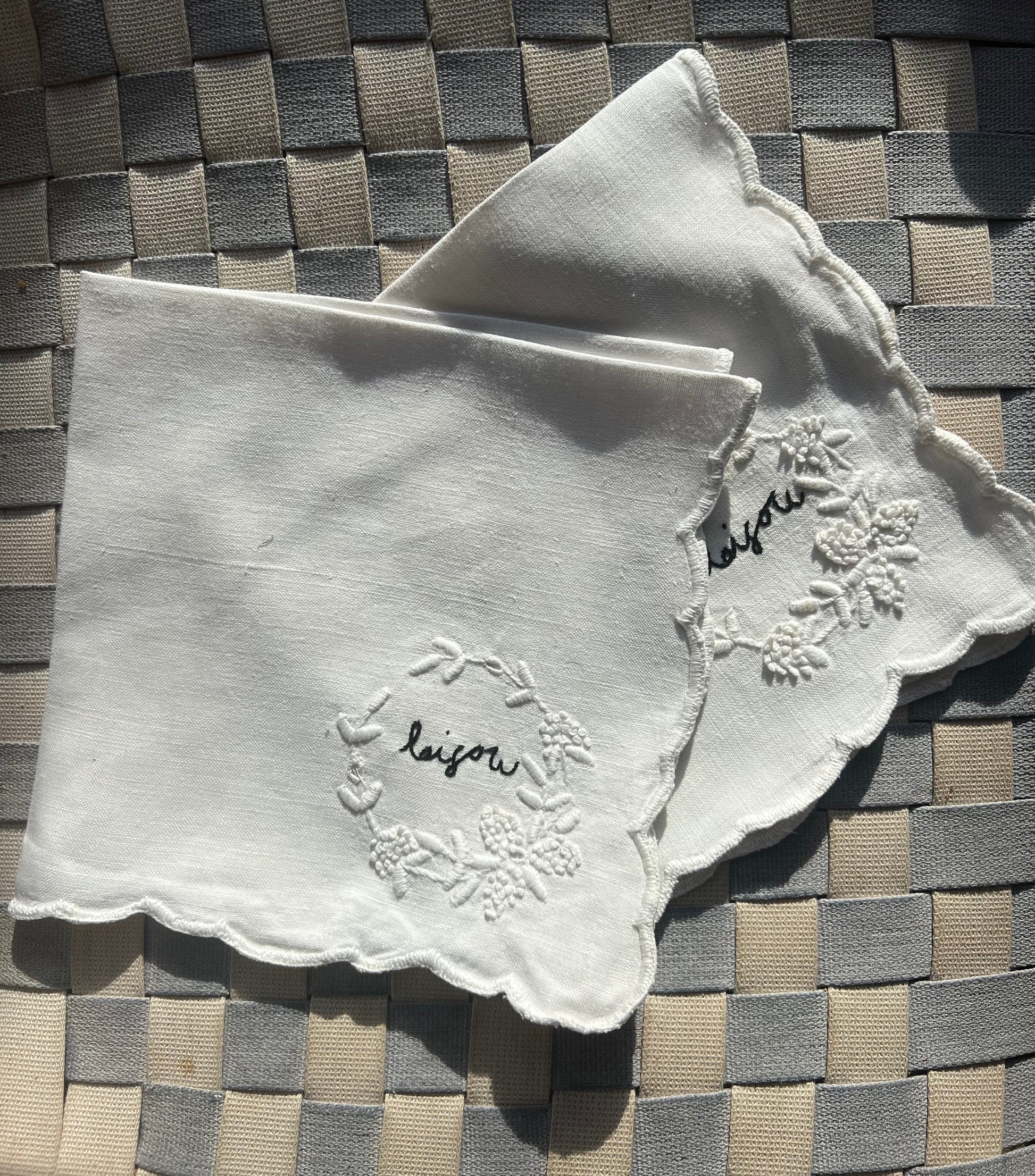 Deux bisou! 💋 set of two vintage linen napkins with “bisou” hand embroidered on each by Judith’s.