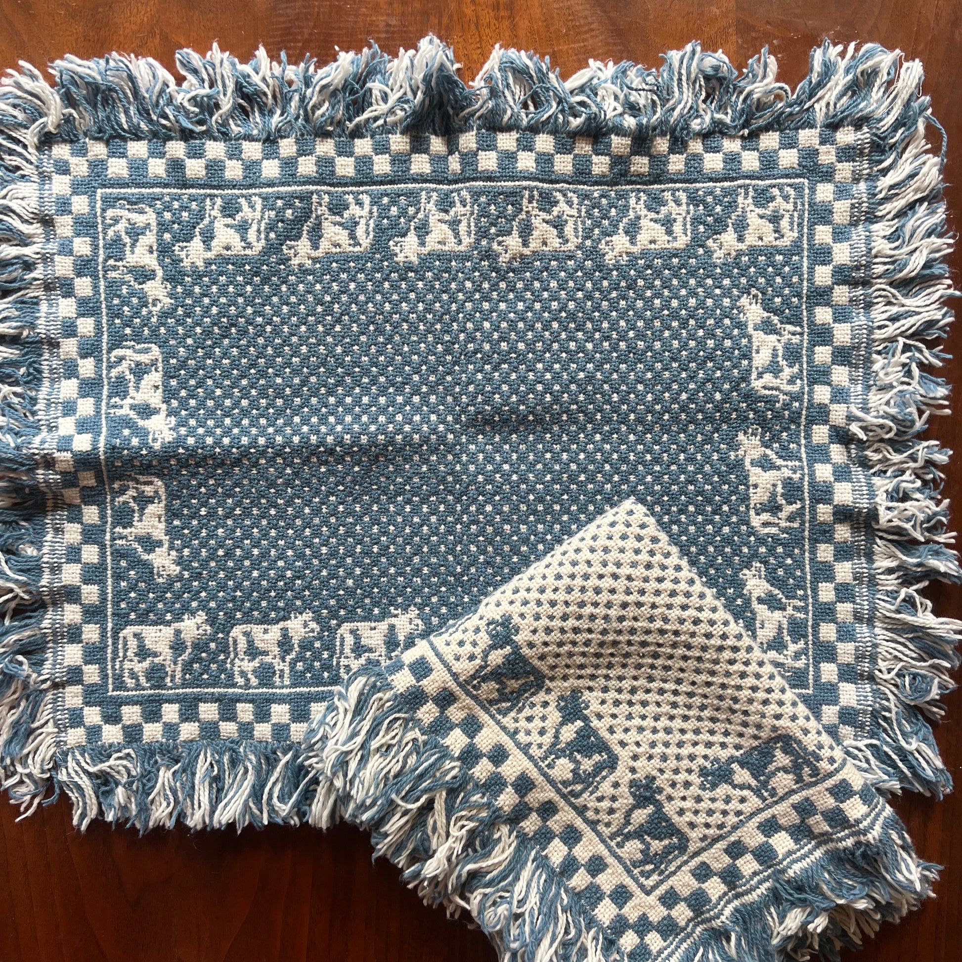 set of 6 funky woven placemats that look like mini blankets. Reversible with little cows!