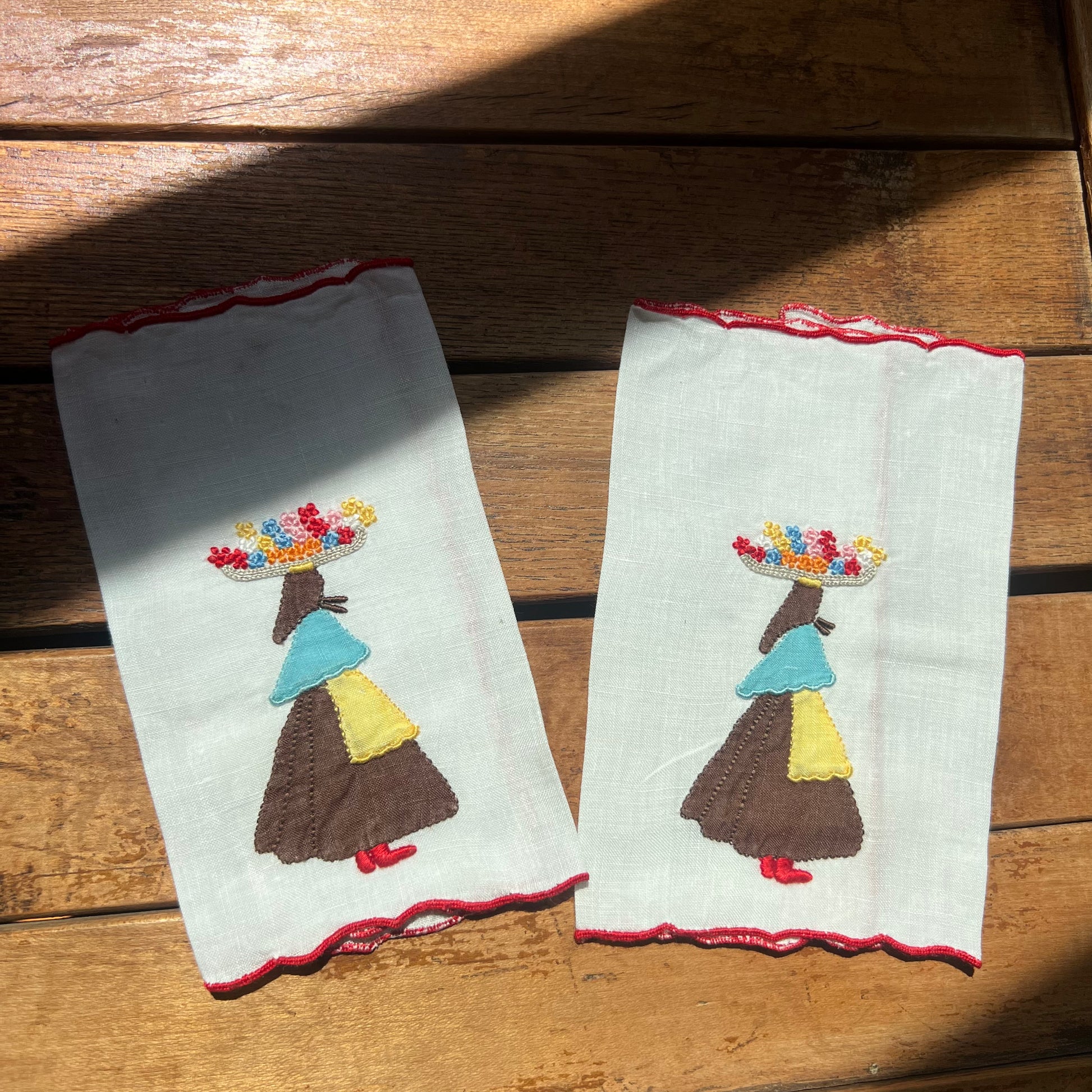 set of two white hankies with hand stitched appliqué and embroidery of a person carrying a basket of flowers on their head.