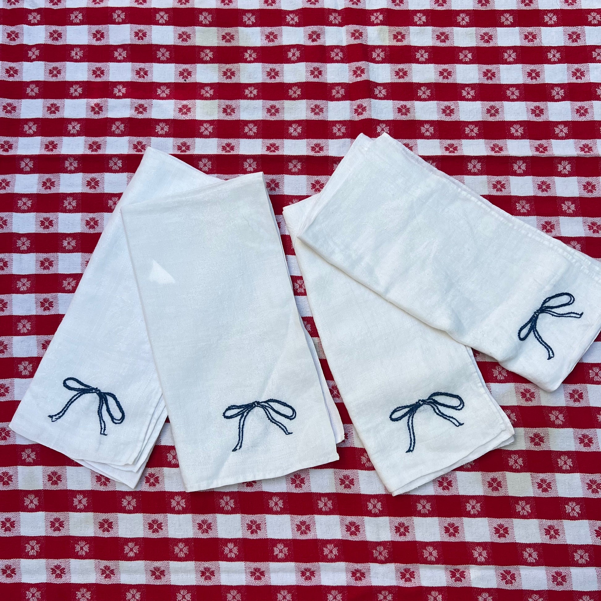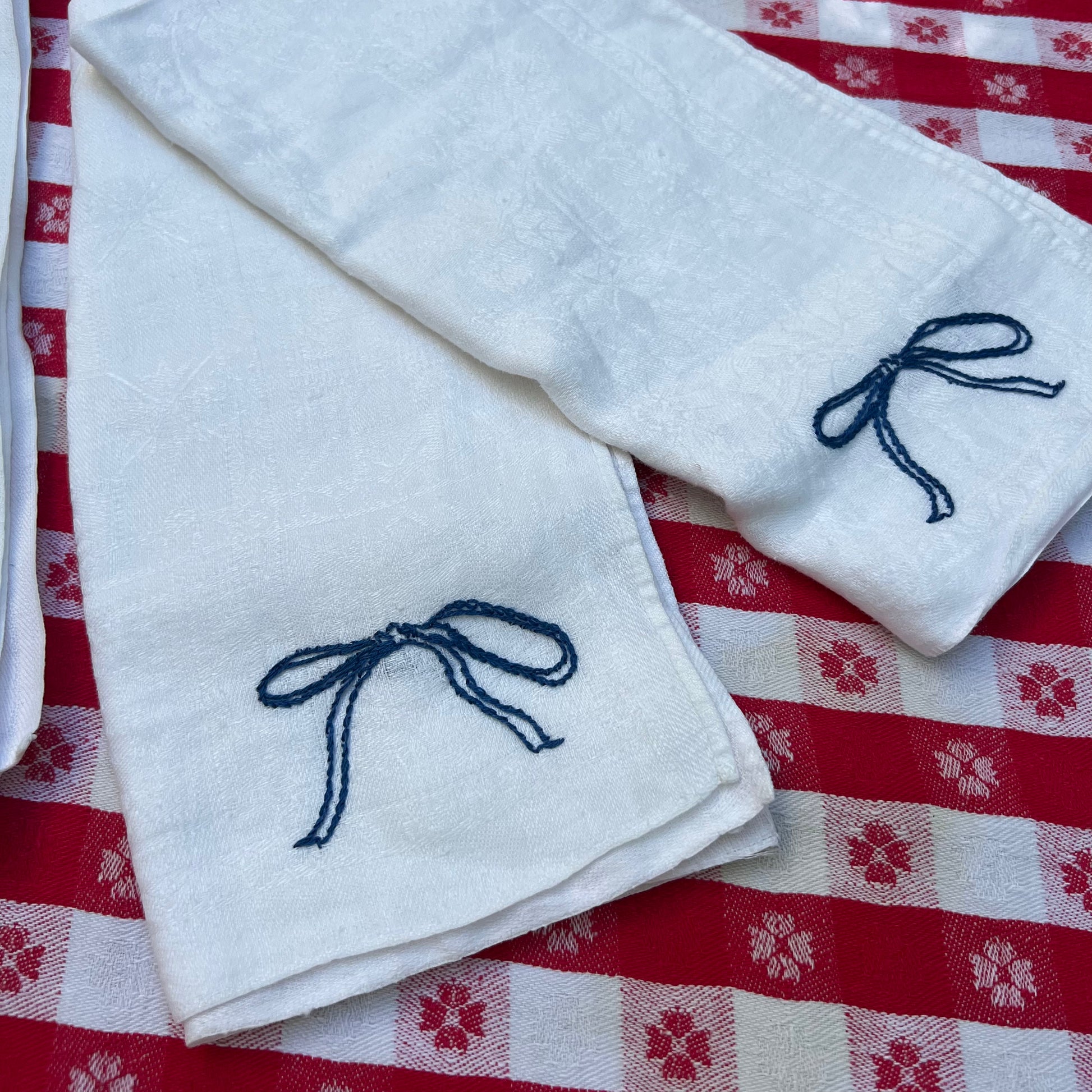 A set of four vintage white cotton tea towels that have been given a new life with some hand embroidery!These all have very faint and slightly different prints and feature a three inch blue bow. Can be used as napkins or tea towels.