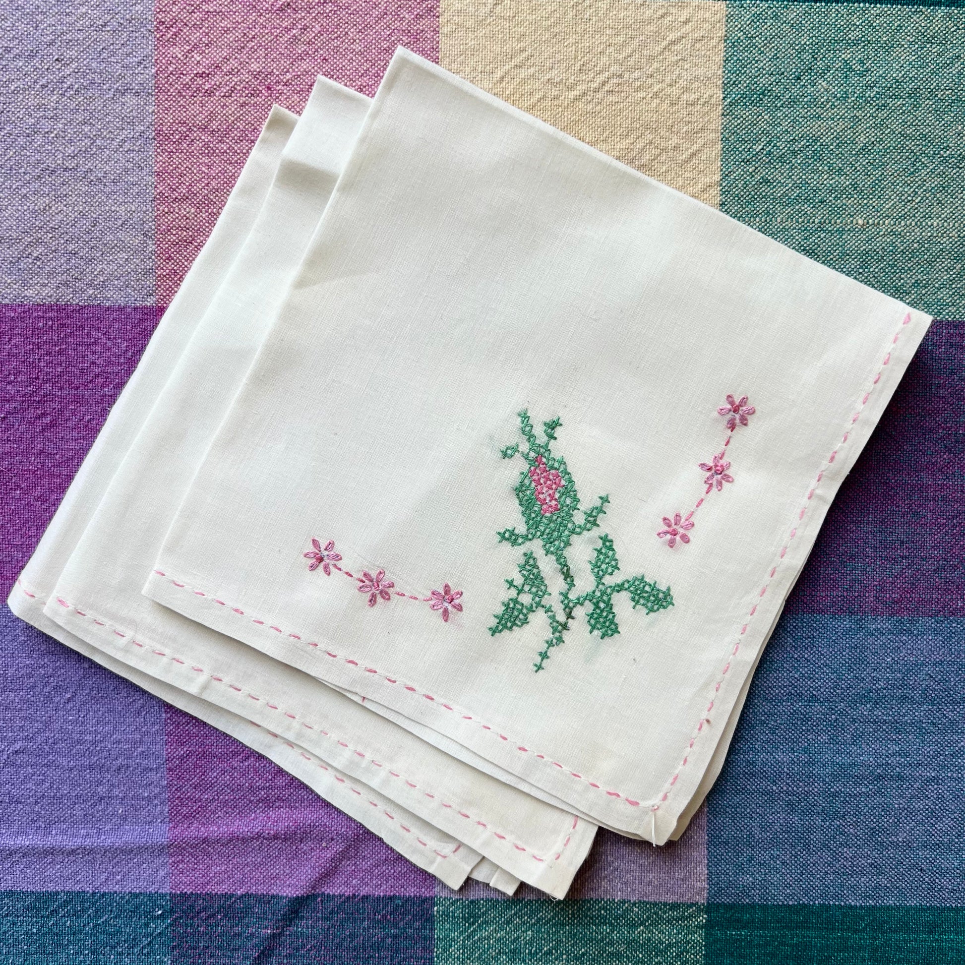 set of 3 vintage cotton napkins with baby pink daisies and a very friendly looking little shop of horrors type plant cross stitched in the bottom right corner <3