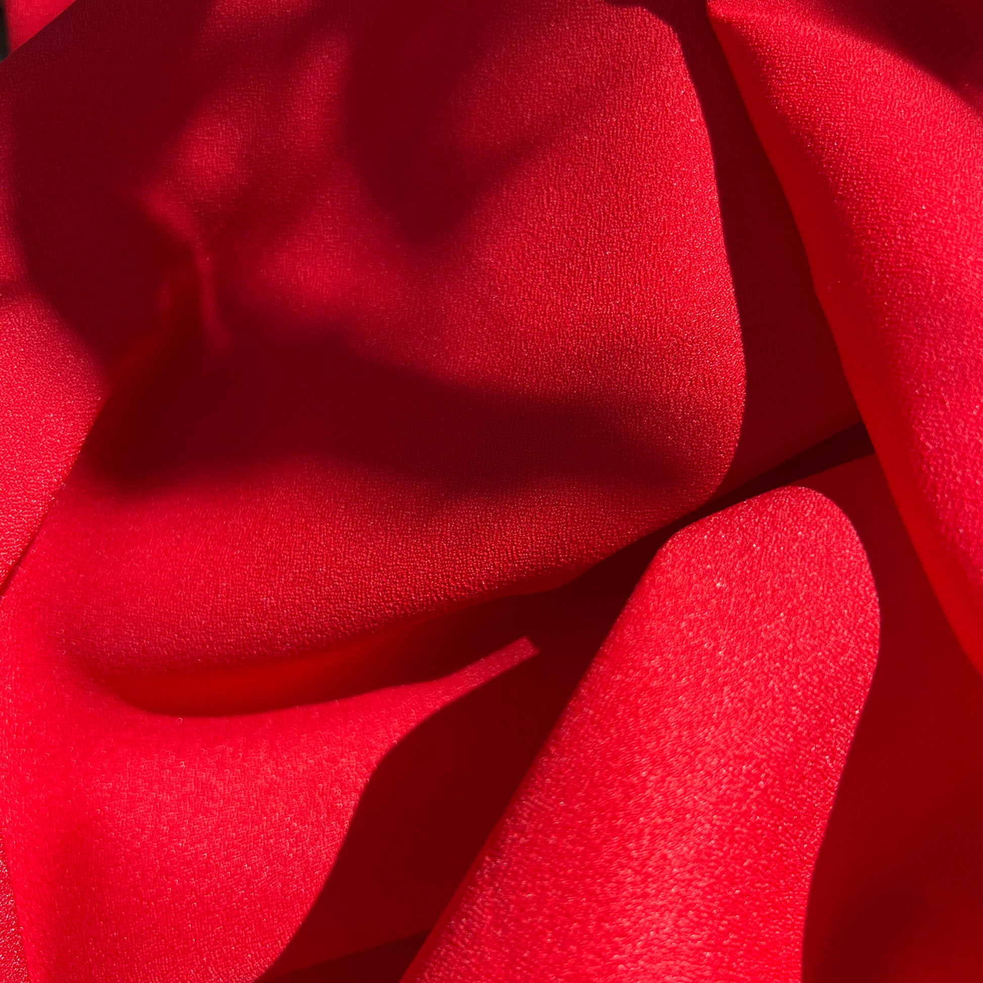 bright cherry red crepe fabric! very lightweight. Best for drapey tops and tanks, dresses, skirts, lightweight shorts/pants.