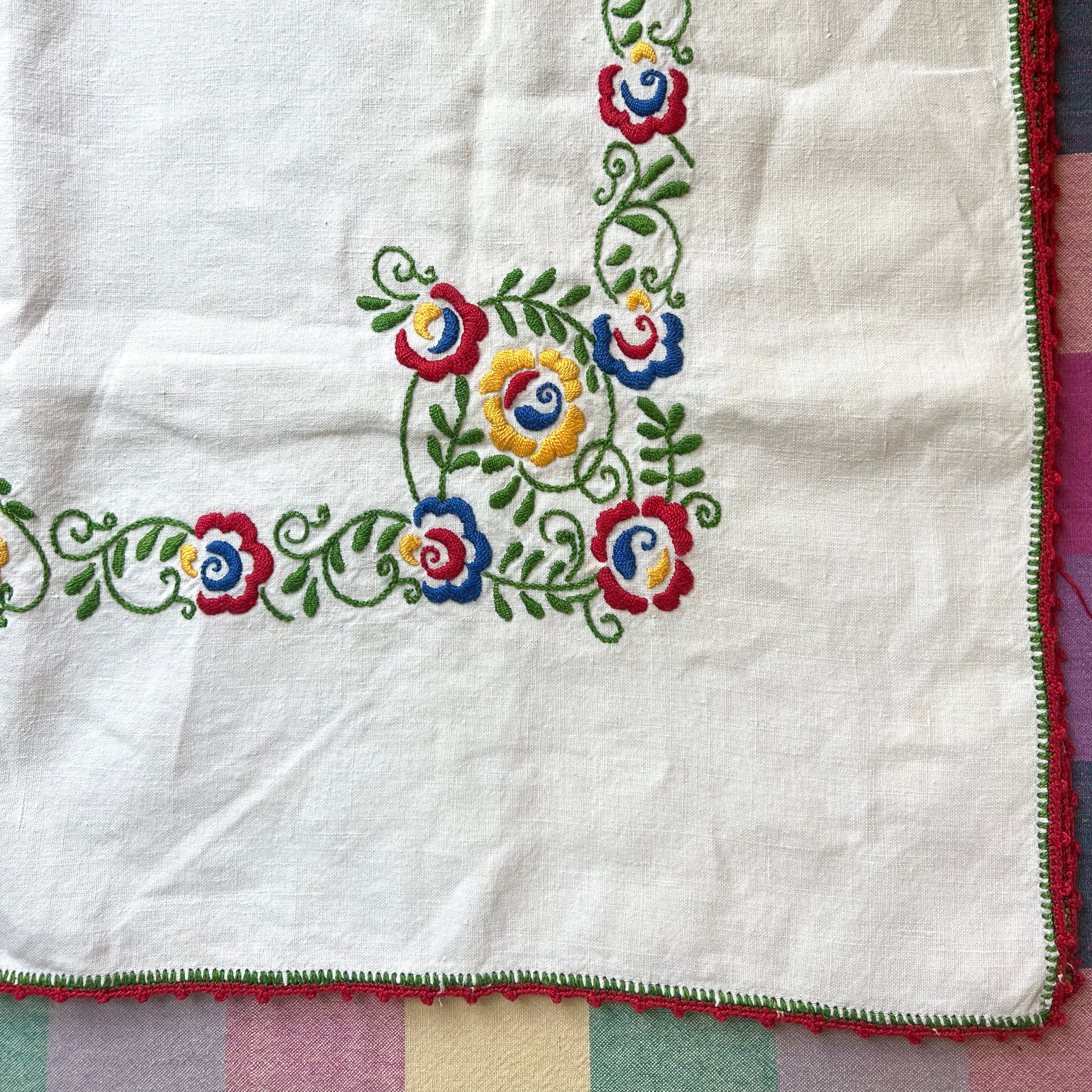 vintage cream table cloth with hand embroidered flowers and crochet trim.