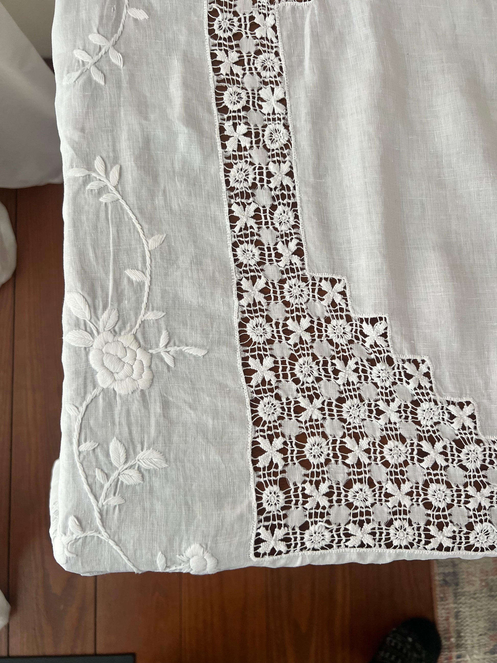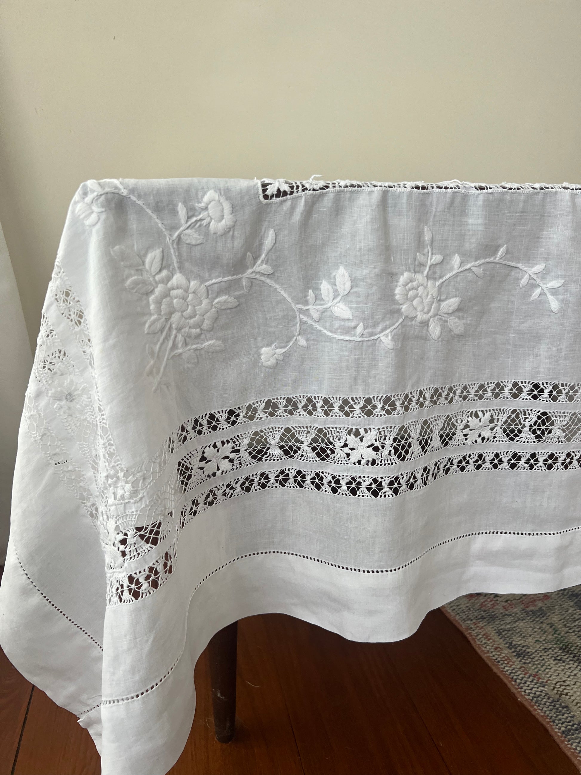 Add some charm to your table with this beautiful lace and embroidered square table cloth. Stark white and perfect condition.