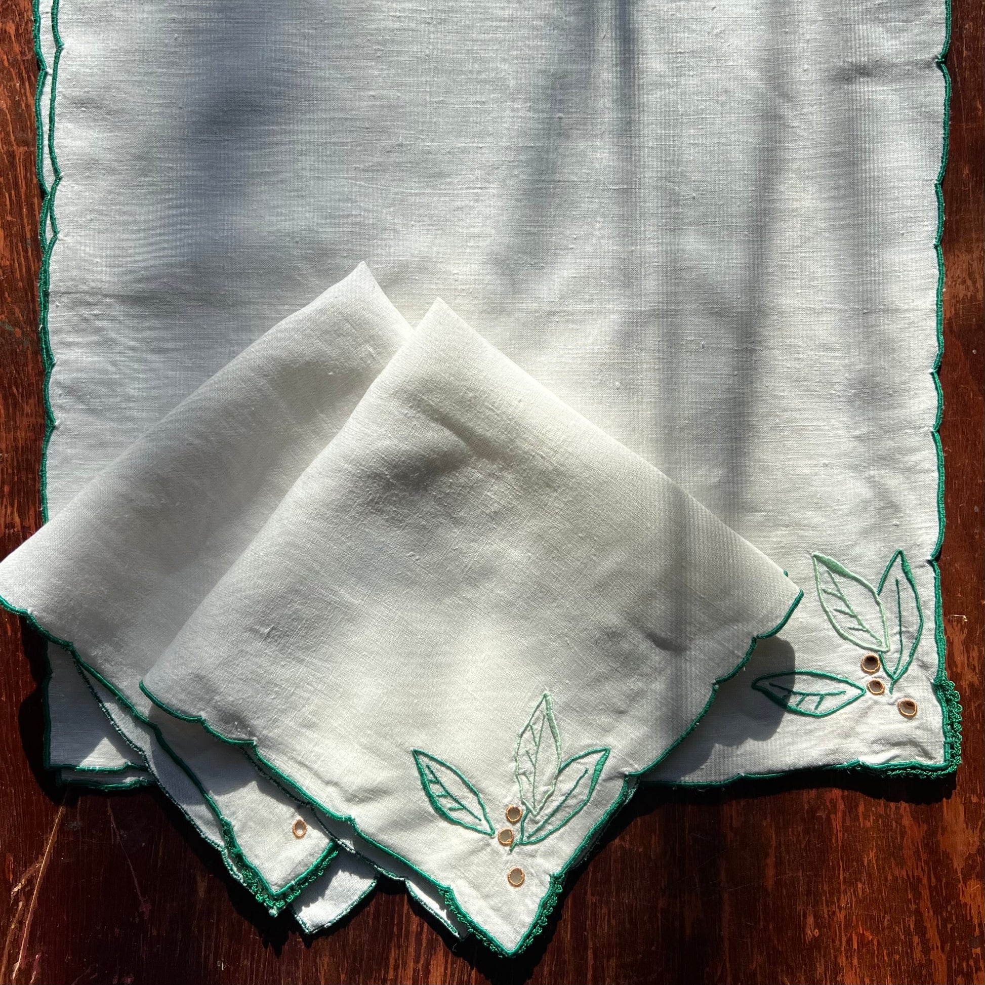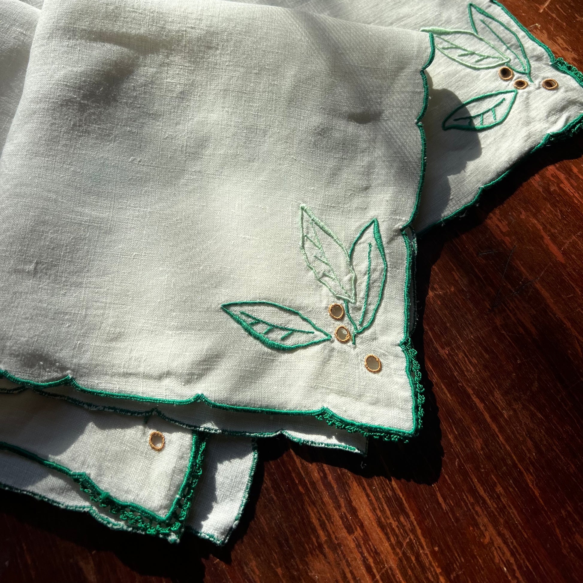 set of 8 vintage cotton/linen napkins with green scalloped trim and embroidered leaves on each corner. These are 7"x6.5" when folded and 13.5"x14".