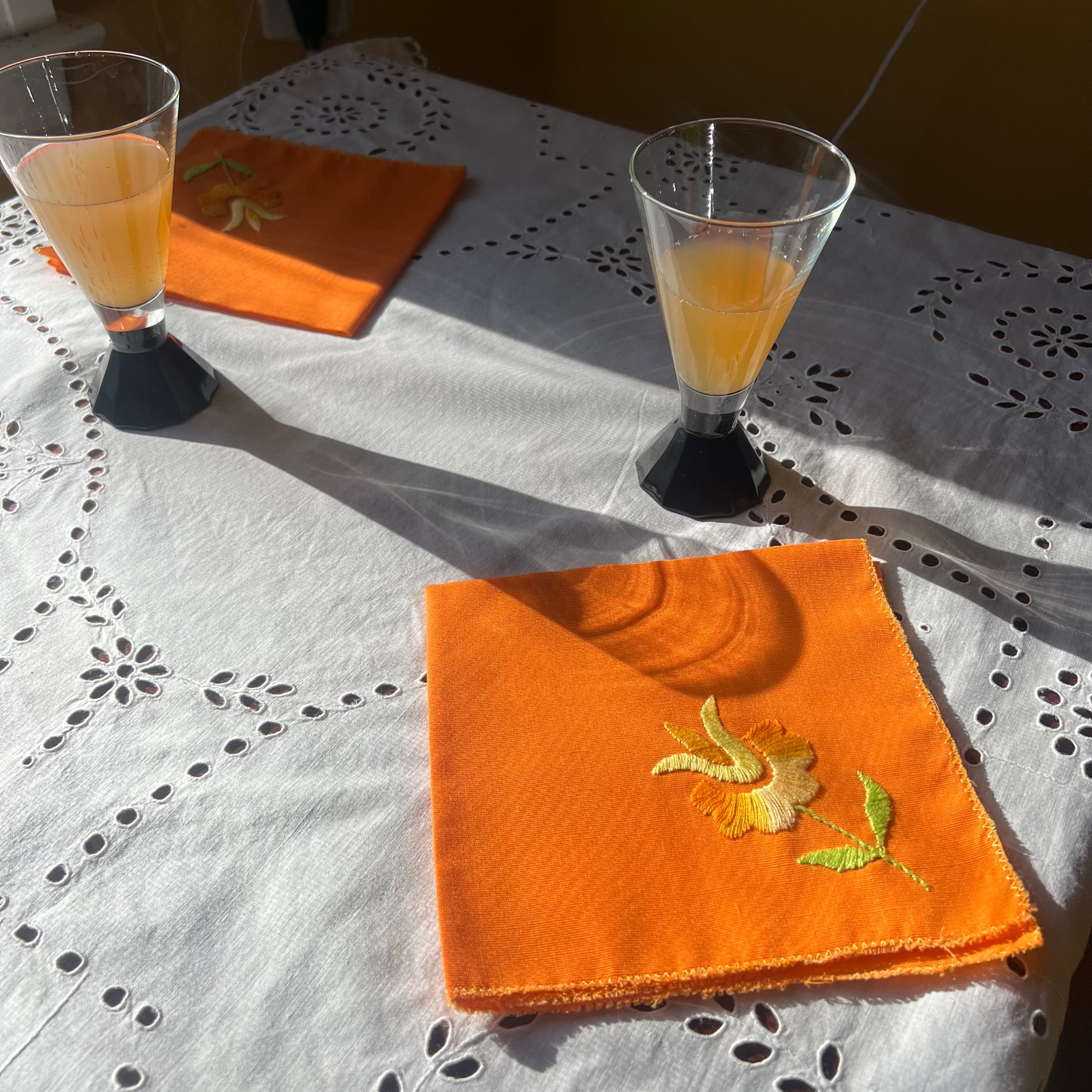 Set of 4 orange napkins with floral embroidery. These are definitely handmade and finished with a zig zag stitch, so there's a bit of fraying. 6"x6"