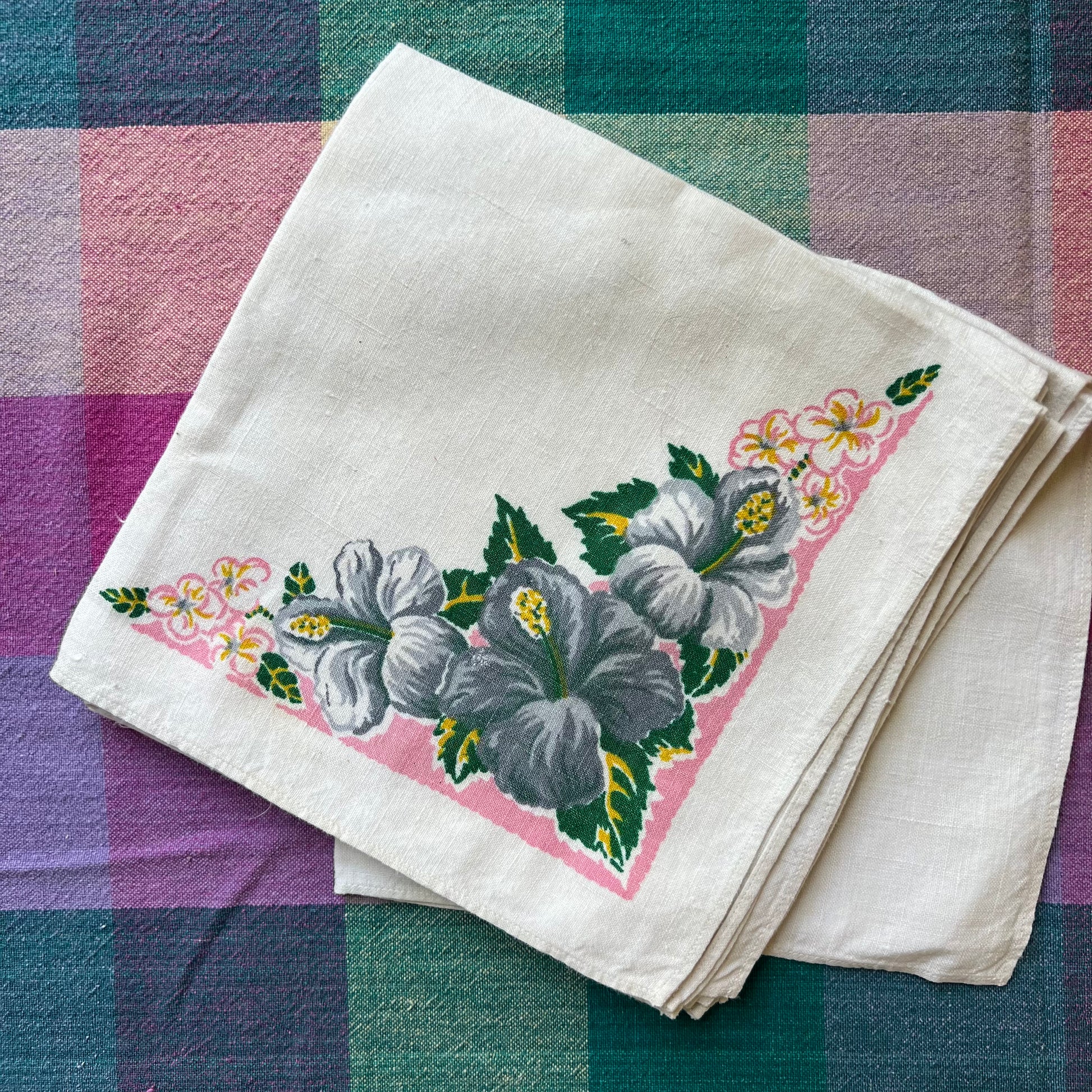 set of four vintage cotton napkins with pink and grey hibiscus floral print.