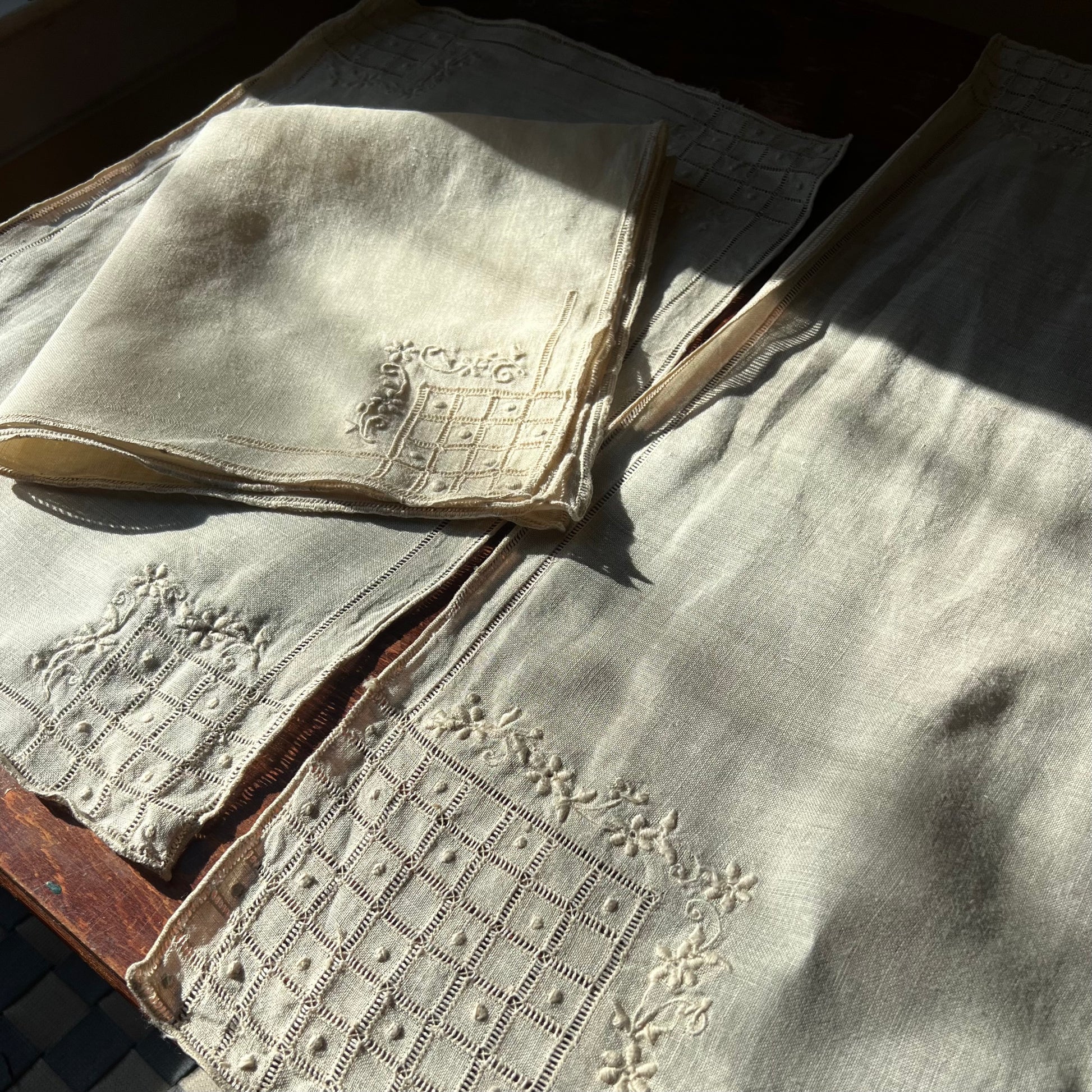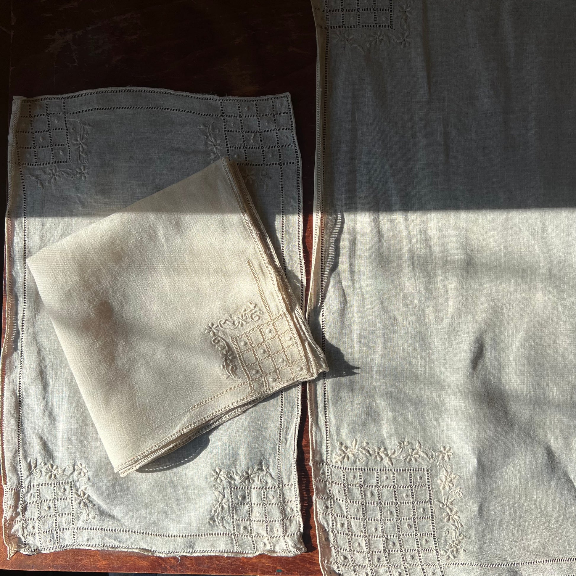 Stunning vintage table linen set with hand embroidery and decorative edges. This set included matching cloth napkins, placemats and a table runner.