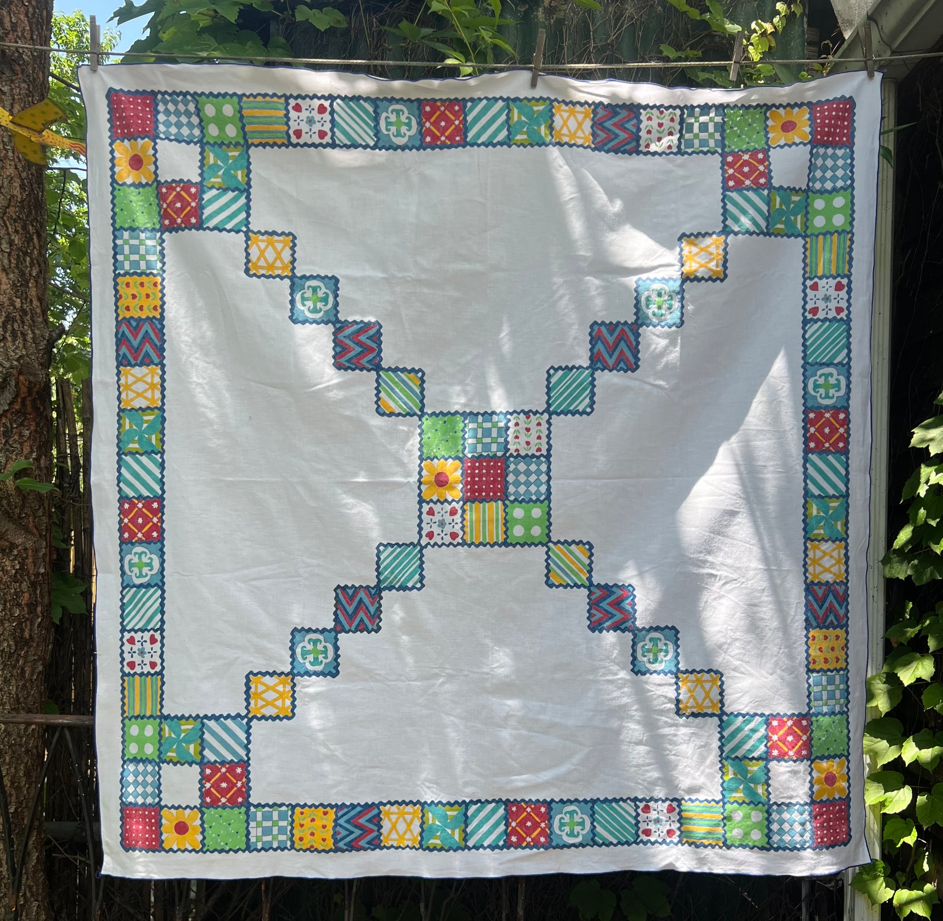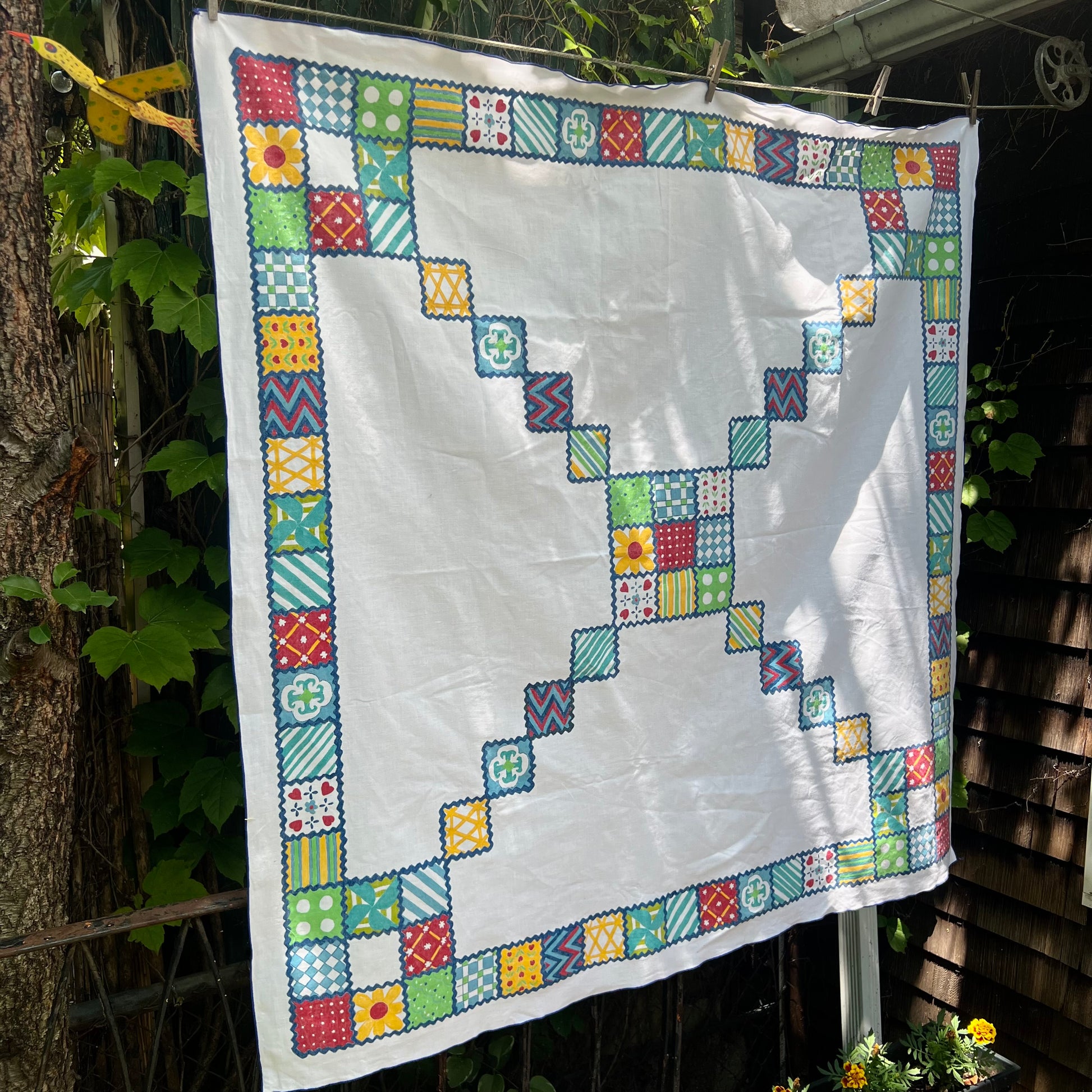 Such a fun one!!! Vintage square tablecloth with blue stitched edge and patchwork print.