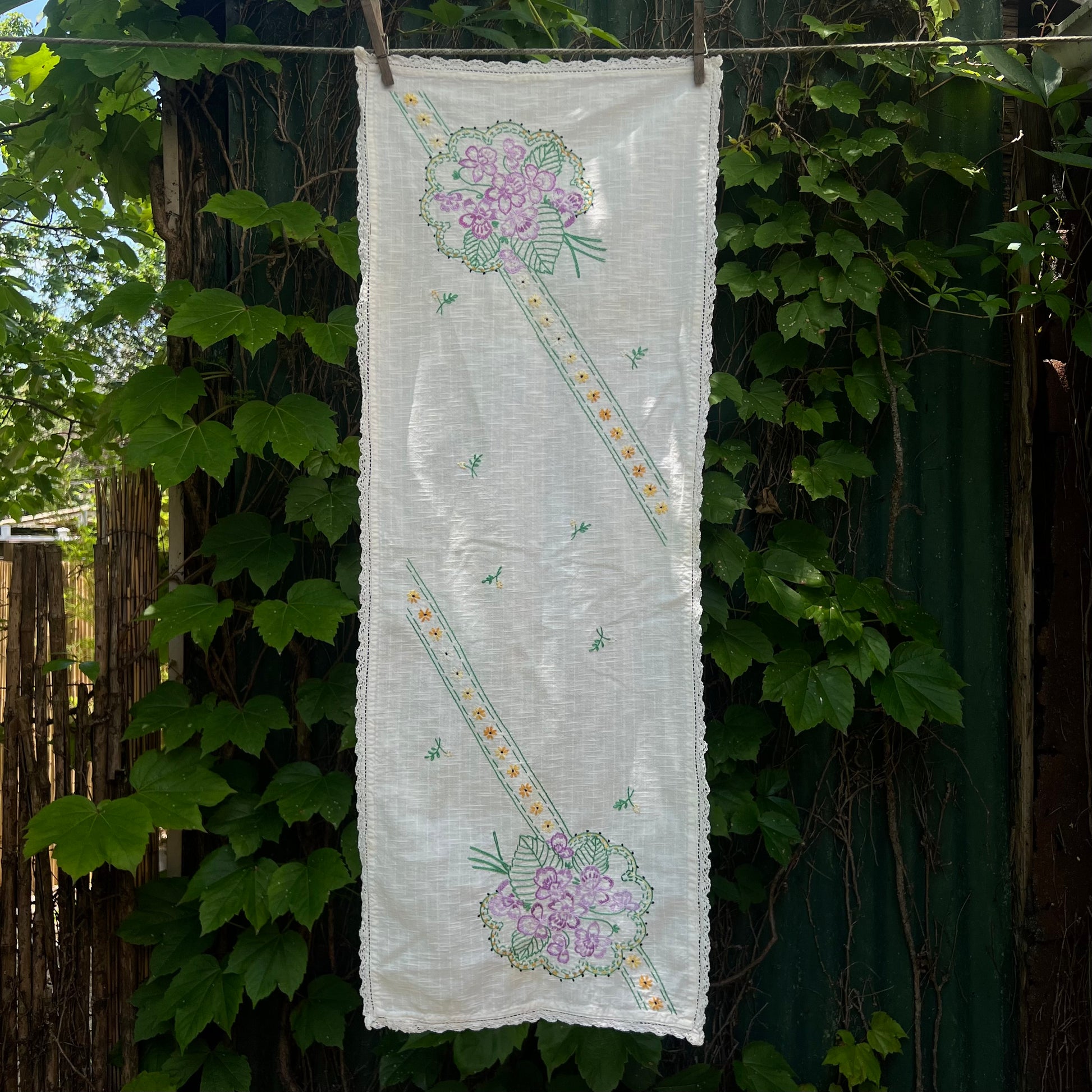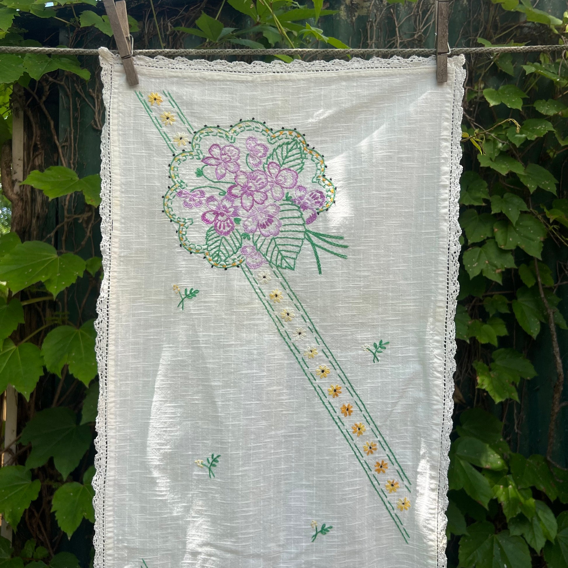 Vintage table runner with purple and yellow hand embroidered flowers.