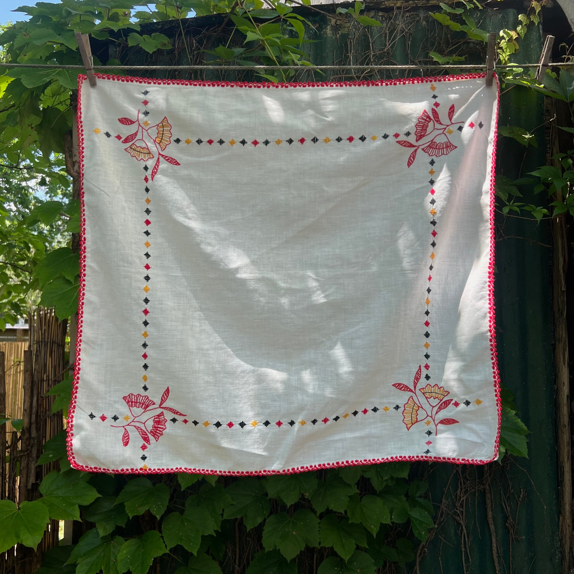 Vintage card table cloth (basically just a small tablecloth) with red trim and pristine hand embroidery.