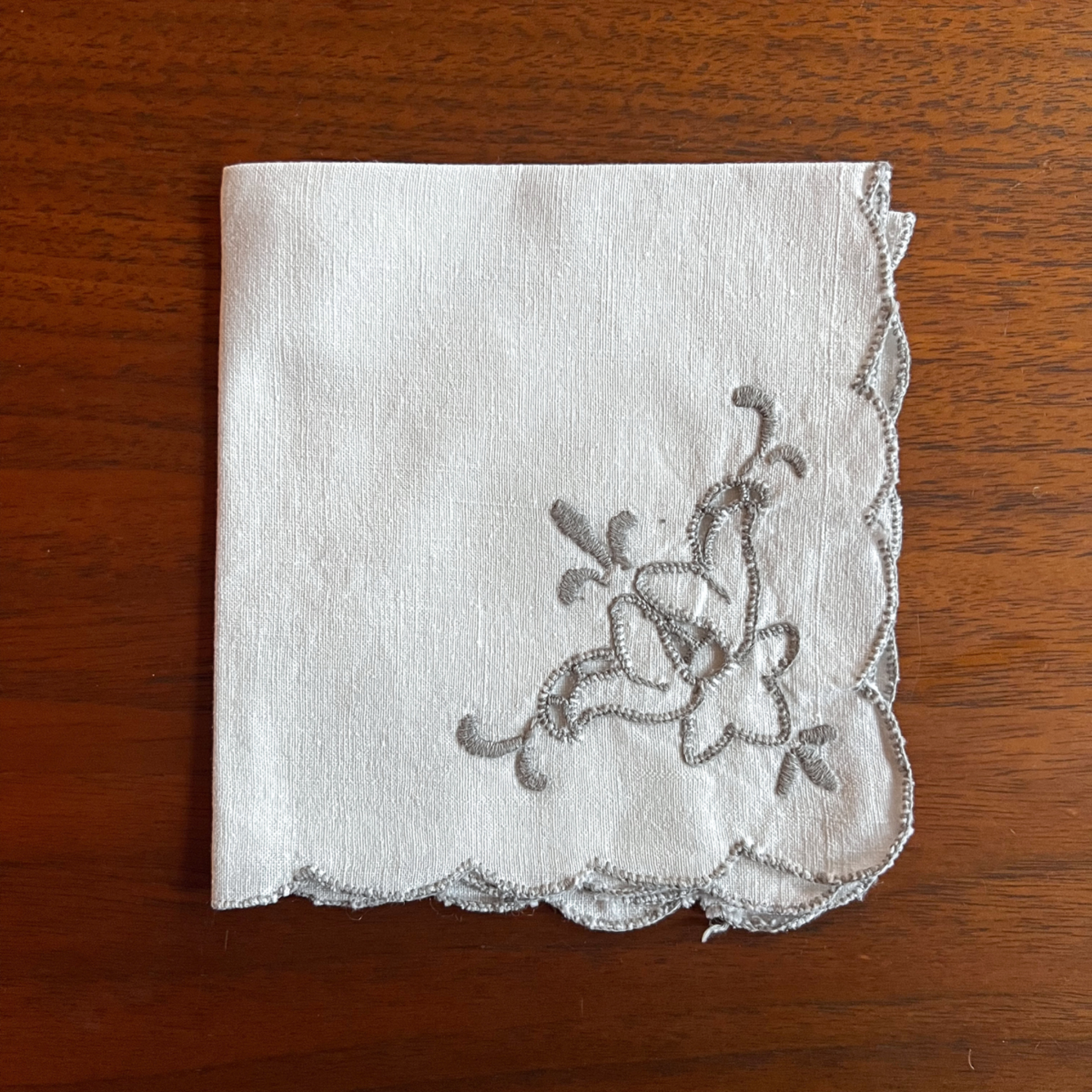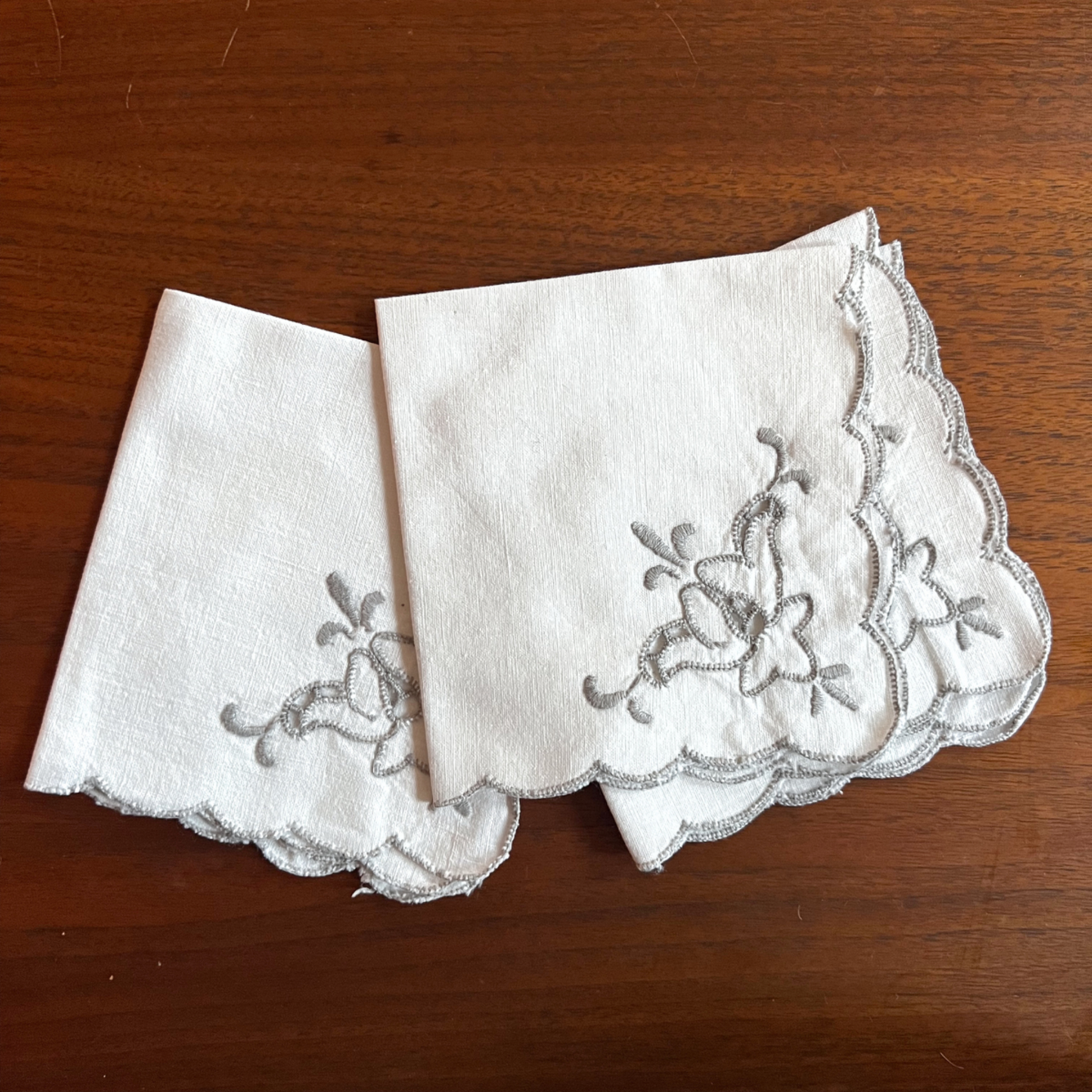 set of 3 white vintage cotton napkins with a light grey scalloped edge and embroidery.