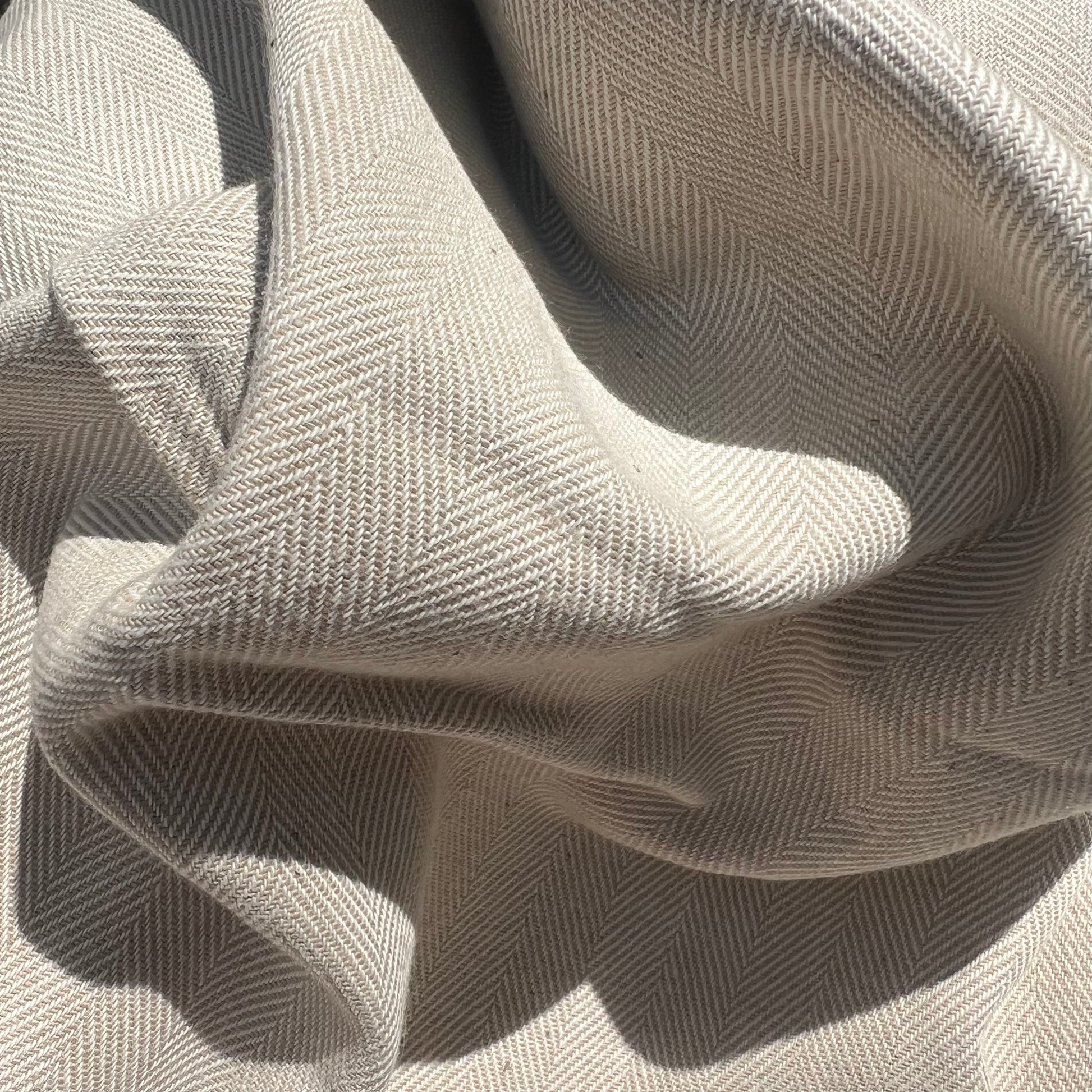 Herringbone woven fabric in a sandy beige. technically this bundle of fabric is for upholstery, so its a little heavier in weight. Best for pillowcases, structured trousers, shorts & jackets.